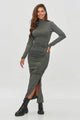 The extraordinary black dress that exudes elegance and sophistication. The model has a fitted cut that emphasizes the figure. Ruching on the sides adds texture and accentuates the waist and hips, while masking imperfections of the silhouette. The dress has long, sheer mesh sleeves that create a subtle contrast with the opaque bodice of the dress, contributing to its elegant and modern look. The neckline is a combination of sheer fabric and a V-shaped neckline, adding a sensual character to the design. Additionally, there are striking shoulder pads that emphasize the shoulder line. An elegant addition is the gold button placed at the back of the dress, which makes it easy to put on the outfit. The dress reaches the ankles and has a flirtatious slit, allowing freedom of movement and adding a touch of finesse. The model is perfect for formal occasions or evening outings, balancing sophistication with a hint of boldness.