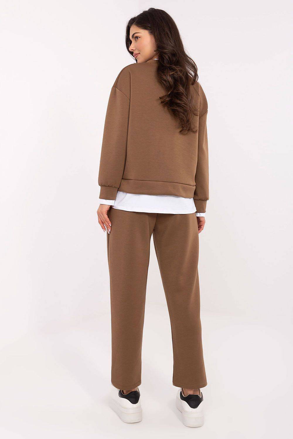 Women's casual set made of a soft, delicate and exceptionally pleasant to the touch material. The set consists of a sweatshirt with a round neckline and high-waisted pants, creating a comfortable and stylish everyday look. The sweatshirt has long sleeves, neckline, and hem lined with contrasting fabric and a subtle patch. The pants with straight legs are equipped with a high waist with a tie and side pockets, providing comfort and a modern silhouette. The smooth pattern and the combination of viscose with elastane guarantee softness, flexibility, and freedom of movement. This set is perfect for everyday outings, combining comfort, elegance, and casual style.