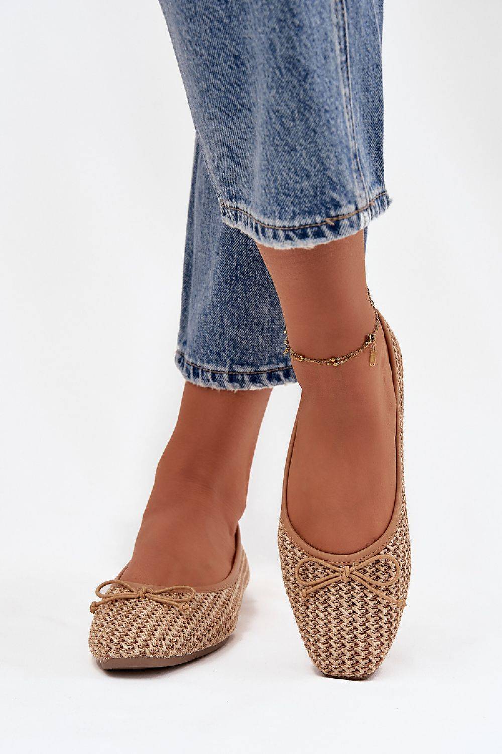 Women's ballet flats made of braided material are lightweight and stylish footwear perfect for everyday wear. The model with rounded toes looks classic and feminine, and the flat sole ensures comfort while wearing. At the front, there is a cute bow tie that adds a delicate, girly character to the shoes. The interior is equipped with a soft eco-leather insole, guaranteeing comfort throughout the day. Perfect for work, a walk, or everyday outings.