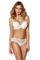 Lovely bra model with padded cups in balconette cut. Cups made of elastic satin partially covered with lace. Underwires model. Lace sides and bridge. Strapless, non-removable and adjustable length. Balconette cut beautifully shapes breasts and rounds them. Sides and back made of smooth knitted fabric. Between cups a small jewelry decoration. Model collects breasts well and makes them beautifully modeled and the neckline looks very tempting. Three-row fastening on two hooks.
