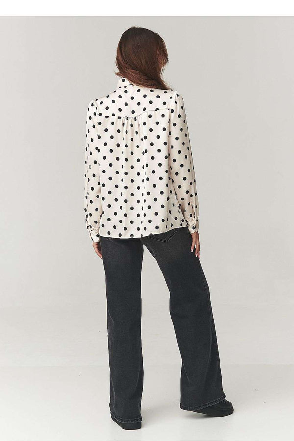 Stylish polka dot shirt is a classic that never goes out of style. Made of lightweight, pleasant to the touch material, it ensures comfort throughout the day. The looser cut with a slightly tailored silhouette beautifully flatters the figure, emphasizing femininity and adding lightness to any outfit. The decorative bow at the neckline gives the shirt a unique character - you can tie it in an elegant knot or leave it loose for a more casual look. Long sleeves with cuffs add sophistication to the whole, and the classic polka dot pattern catches the eye and enlivens even the simplest outfit. It pairs well with jeans, as well as elegant trousers or a skirt. Perfect for work, meetings, dates, or family gatherings, this is a model that will work in any season. Made in Italy.