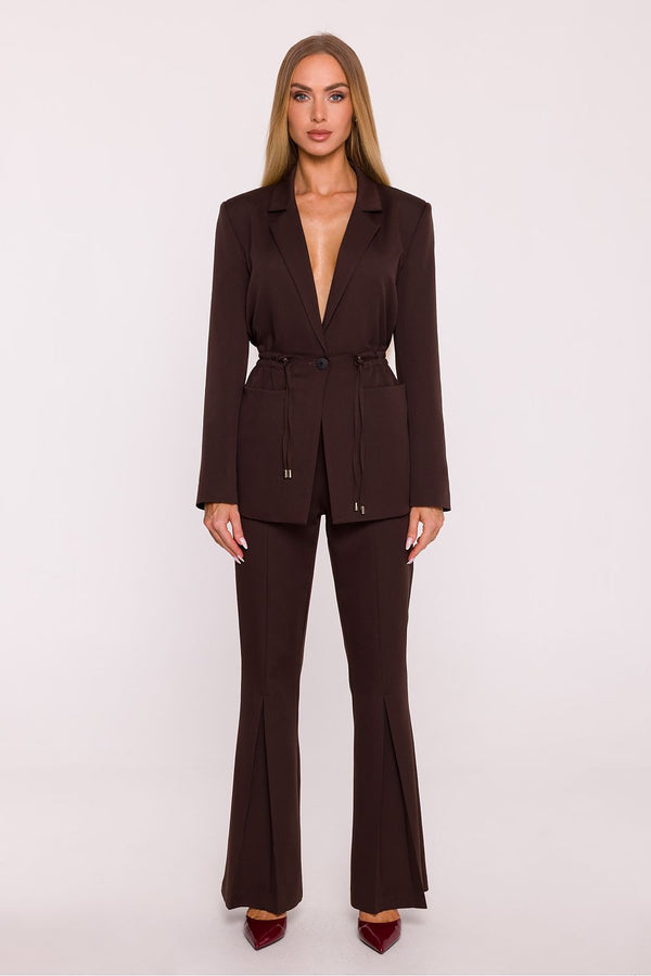 Elegant women's trousers made of smooth suit fabric with a matte finish are a proposal that combines classic with modern style. The material is light, drapes well on the silhouette, and emphasizes the fitted cut. The high-waisted model beautifully accentuates the waist and visually elongates the figure. The trousers have long, flared legs, and the stylish pleats at the front add elegance and lightness to movement. The concealed zipper closure at the back ensures aesthetic and comfortable use, while the side slip pockets add functionality, maintaining the minimalist character of the trousers. The fitted cut at the hips, flaring towards the bottom, creates a harmonious silhouette that looks stylish and feminine in any situation. The trousers reach the ground, allowing them to be paired with both heels and elegant flat shoes. Designed and made in Poland for women who appreciate classic elegance, perfect finishing, and comfortable wear.