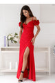 Elegant long dress with a deep wrap neckline, thin straps and sleeves with roses. Dress fastened with a hidden zipper. Bottom with a flap and a slit.