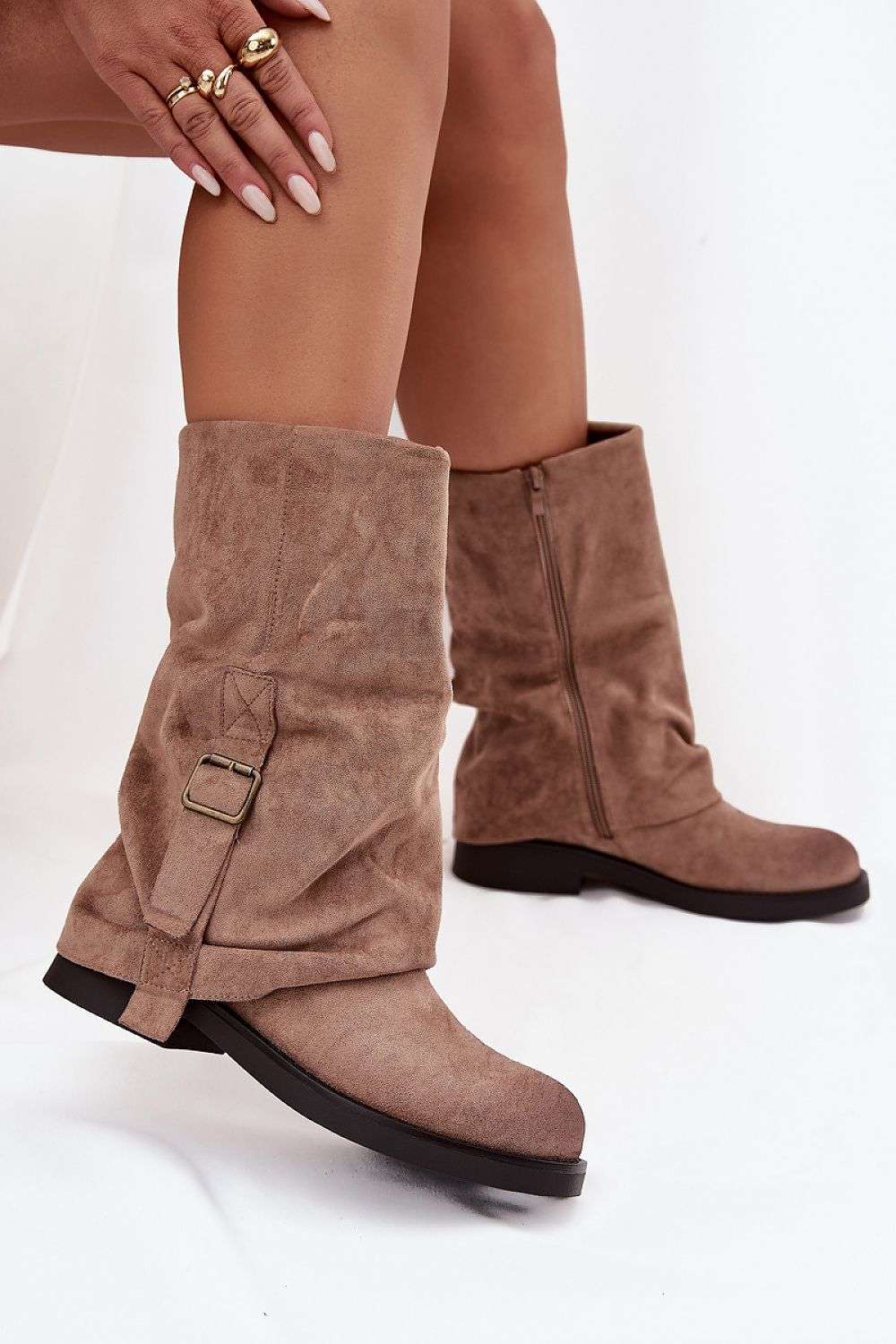 Women's boots made of eco suede are the perfect choice for women who appreciate style and comfort in one. The model set on a flat heel provides comfort during daily wear, while looking elegant and feminine. The zip closure makes it easy to put on and take off the shoes, increasing their practicality. The eye-catching, turned-down upper decorated with a buckle strap adds a fashionable character to the whole. The soft texture of eco suede emphasizes the look of the shoes, making them a perfect complement to autumn-winter stylings. These boots will work great both with skirts and dresses, as well as with fitted pants, creating a stylish, everyday look.