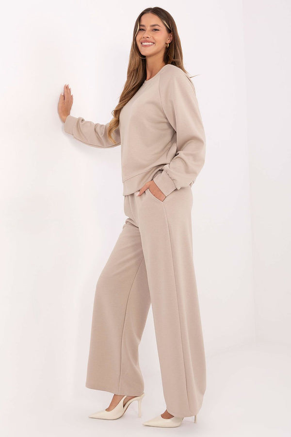 Women's tracksuit made of exceptionally soft butter-like material is the perfect combination of comfort and style for everyday wear. The fabric made of a blend of viscose, polyester, and elastane is incredibly delicate, flexible, and pleasant to the touch, making the set perfect for both at home and out in the city. The set consists of a blouse with a loose, casual cut and high-waisted pants with an elastic waistband for a perfect fit. The wide legs give the outfit a lightness and a modern look, while the side pockets emphasize the practical character of the set.
