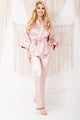 Two-piece set made of high-quality, delicate satin-like fabric resembling silk. The blouse has a kimono cut with a waist emphasized by an attached belt. Long, straight pants with wider cuffs add sophistication. The Perai set is an elegant pajama proposal that will fit even the most demanding interiors. In this set, you will feel sensual, elegant, and feminine. The cardboard packaging in which the pajamas are located will be perfect as a gift.