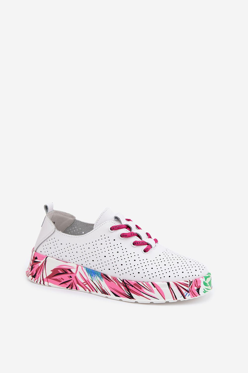 Shoes are a comfortable and stylish proposition for everyday use. Lightweight and comfortable, they are perfect for daily wear, providing freedom and comfort with every step. The model is set on a patterned platform that attracts attention and gives a modern character. Lacing with decorative inscriptions emphasizes their fashionable style, while allowing for a good fit to the foot. The perforated upper ensures proper ventilation, increasing comfort, especially on warmer days. The leather Comfort Shoes insole ensures comfort and proper foot support. It is the perfect choice for women who appreciate original appearance, lightness, and comfort in everyday footwear.