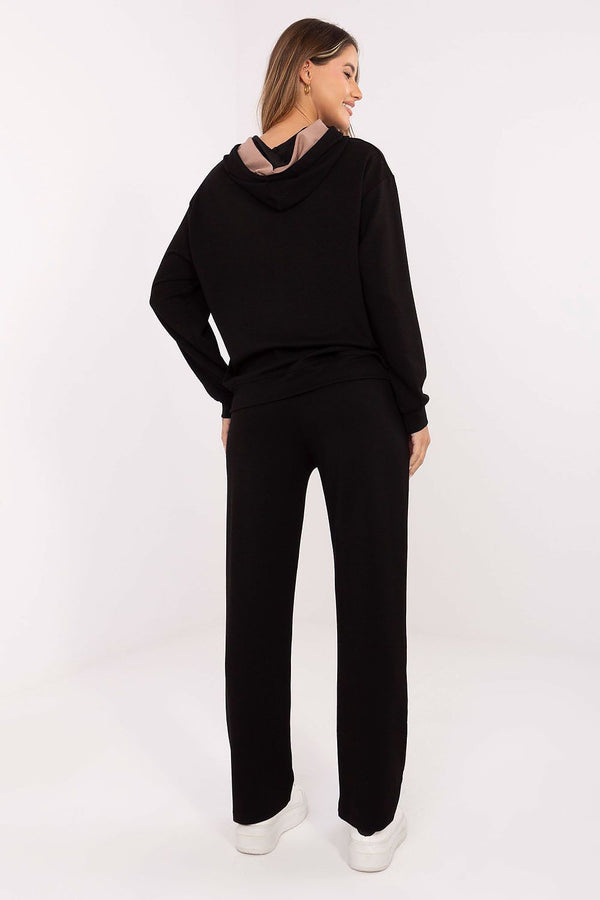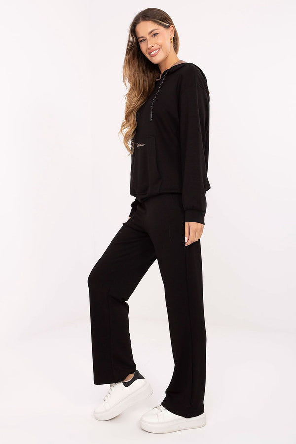 Women's tracksuit set consisting of a sweatshirt and pants in a casual style, perfect for everyday occasions. Made of exceptionally soft buttery material that is gentle and pleasant to the touch, with a predominance of viscose and a touch of elastane for greater comfort. The sweatshirt is of standard length with long sleeves, a hood, and a practical kangaroo pocket, decorated with subtle embroidery. The pants have a high waist, straight legs, and side pockets, also embellished with a small embroidery on the waist. Smooth material and minimalist design make the set combine comfort with modern style.