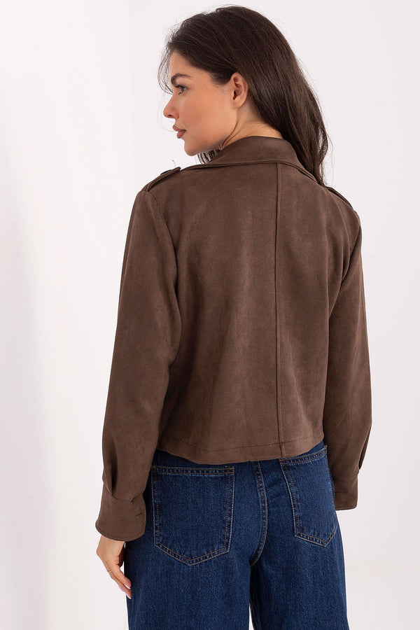 A short suede coat is a stylish casual option, perfect for everyday wear and work. Made of a polyester and elastane blend, it combines comfort with an elegant look. Double-breasted button closure and lapels give it a classic character. Epaulettes on the shoulders emphasize a trendy, slightly military style. The smooth pattern and short length make the coat perfect for various stylings. Long sleeves make it a practical choice for colder days in the fall/winter/spring season. A transitional model, without insulation, perfect as a light outerwear. This is a versatile coat that combines simplicity with elegance and complements everyday stylings perfectly.