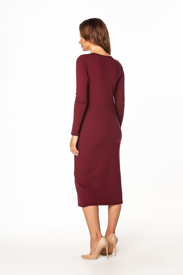 Lång, figursydd och enkel stickad klänning i bomull med båtringning och långa ärmar.